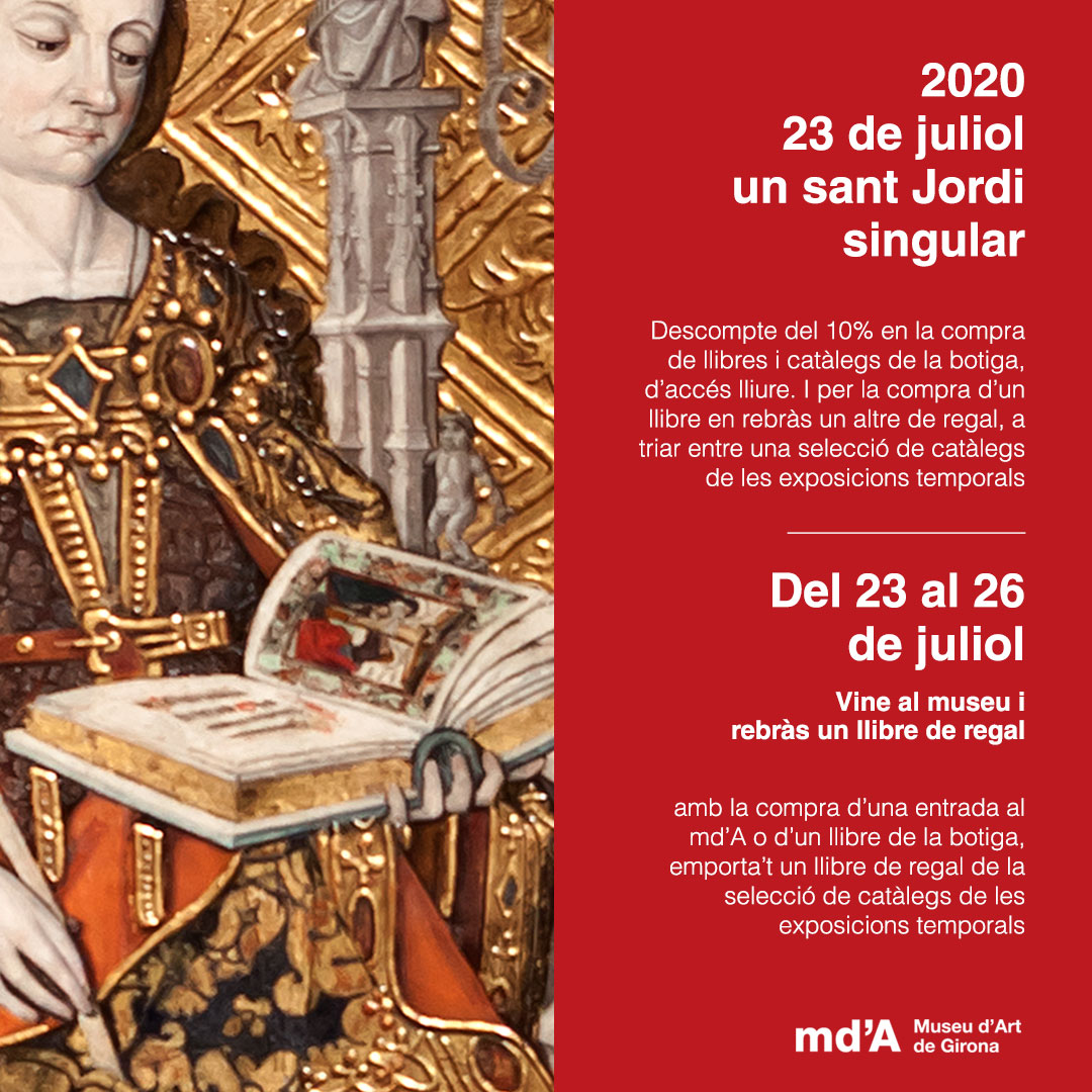 El 2020 està sent un any atípic en tots els sentits. Els estralls de la pandèmia de la COVID-19 han afectat tots i cadascun dels àmbits de la nostra existència. També al Museu d’Art de Girona, que va haver de tancar portes el passat 13 de març, i sortosament les ha pogut reobrir, amb un remarcable desplegament de mesures per garantir la seguretat dels visitants, del propi equip i de les obres, a principis de juny. El mes d’abril el vam passar doncs confinats a casa, teletreballant, i amb ell un sant Jordi que finalment, ateses les circumstàncies, es trasllada enguany excepcionalment al mes de juliol.