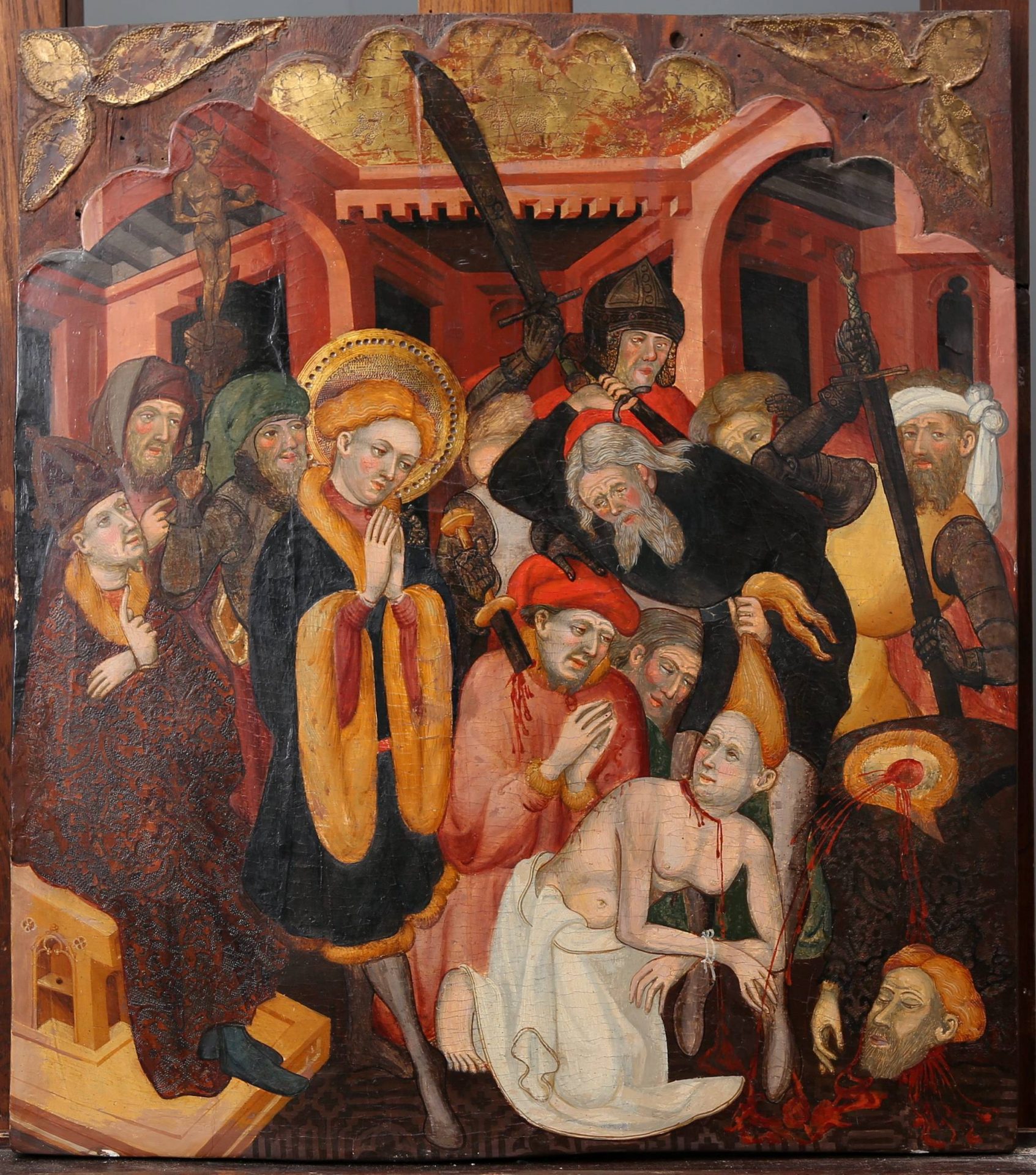Allí s’hi representa pròpiament l’ajusticiament dels familiars del sant en una composició agitada i atapeïda, integrada per nou personatges. Darrere, drets, els botxins dirigeixen les espases contra els màrtirs, que rauen agenollats. Veiem, per exemple, com a l’extrem dret un d’ells ja ha estat decapitat i sagna profusament o com, més al centre, un altre saig manté agafada pels cabells la dona que tot just acaba de degollar, segurament Concòrdia, la nodrissa del sant.