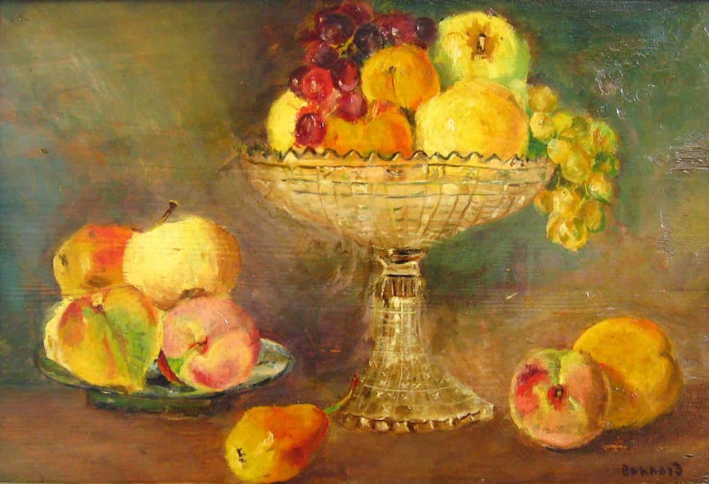 Autor desconegut, Natura morta amb fruita a la manera de Pierre Bonnard (s. XX). Oli sobre fusta, 30 x 43,5 cm Núm. reg. 27, Museu d’Art de Sabadell