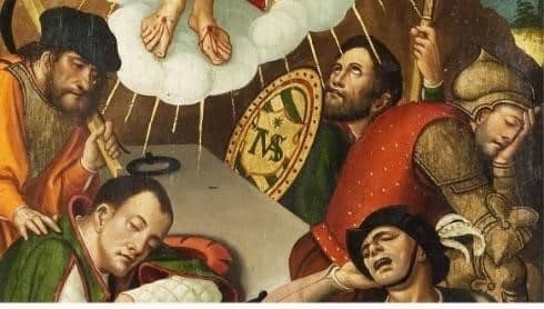 Monograma MTAS. Detall de la taula del Calvari del retaule de Segueró de Pere Mates. Segle XVI. Museu d’Art de Girona. MDG 380-382. Fons Bisbat de Girona