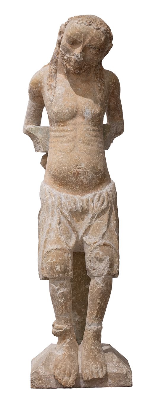 Grup d’un Calvari formen cinc peces: Crist, la Verge, Sant Joan, i dos lladres. Presenta restes de policromia, molt malmesa. La figura de Crist destaca per la seva grandària, desproporcionada en relació a les dimensions de la creu, que mostra al braç superior la inscripció JHS NAZARENUS REX IVDEORUM (Jesús natzarè, rei dels jueus). Cedit el 1868 al Museu Provincial, el grup del Calvari es trobava sobre la llinda de la porta que comunicava el claustre de la catedral amb el desaparegut “cementiri dels Negres”, ubicat a la part posterior de la Catedral, una zona d’enterrament que originalment havia estat cementiri de clergues.