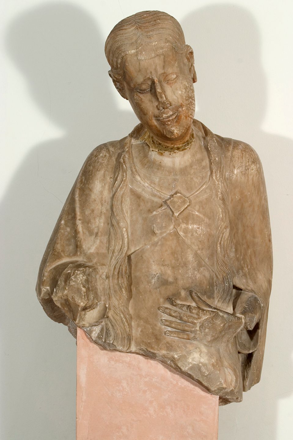 El conjunt es mantingué sencer fins la construcció de la capella de Sant Narcís, ocasió en què fou desmantellat. La guerra del Francès i altres fets del segle XIX contribuïren a la desmembració i destrucció parcial del grup, del qual només quedava la figura del crist jacent. El 1870 11 peces van ingressar al fons de la Comissió de Monuments. L'any 2001, arrel d'unes obres a la basílica de Sant Feliu, es van trobar diversos fragments de les figures perdudes, i alguns s'exposaren temporalment al voltant del crist jacent. Altres fragments van ingressar com quedar Museu d'Art de Girona, i altres als magatzems del mateix, com a part de fons del Museu Diocesà. Entre els fragments conservats al Museu d'Art de Girona trobem aquest bloc d'alabastre, que, juntament amb el número de registre 001752 i 001753 formen la part superior de l'escultura de Maria de Clopas.