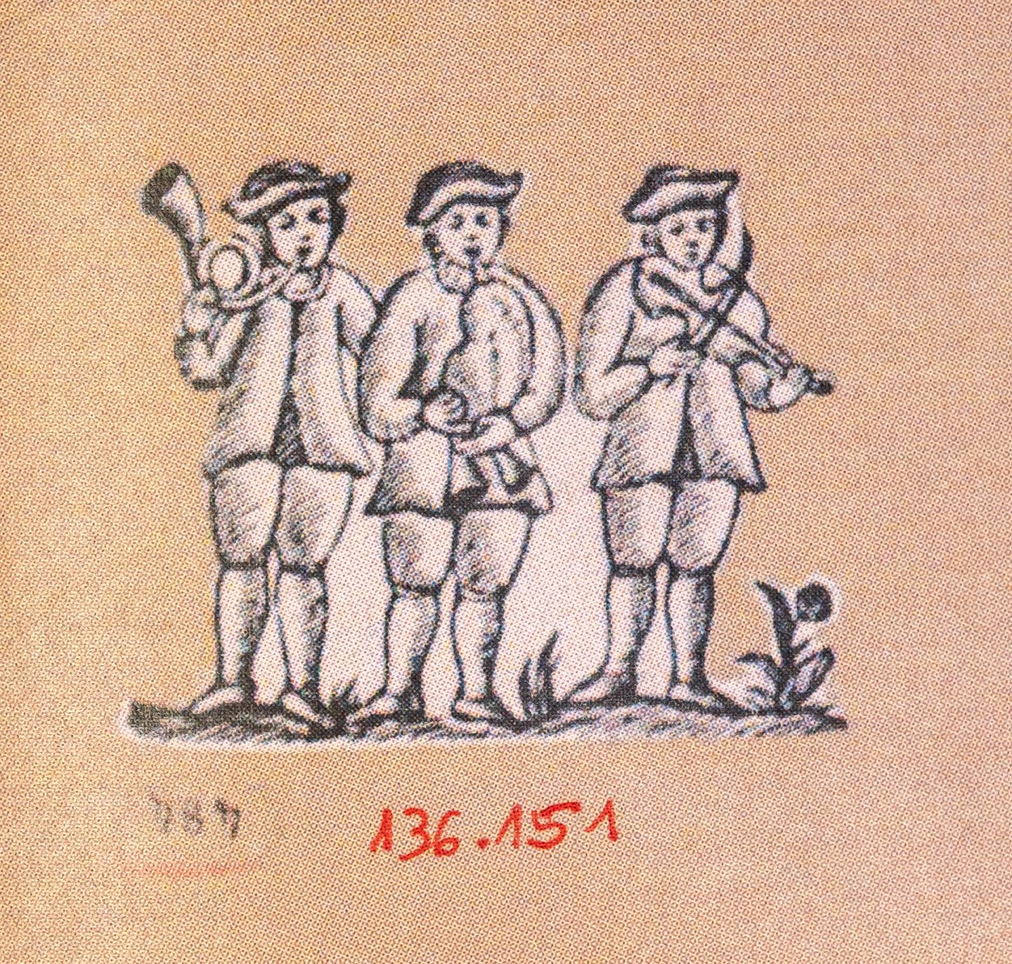 Músics amb violí, cornamusa i trompa (cobla de tres quartans)