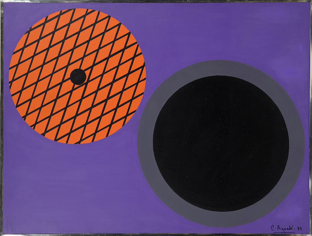 Carme Aguadé (Barcelona, 1915 - 2013), filla del polític i alcalde de Barcelona, Jaume Aguadé, i de la pianista i pintora Carme Cortés, es va formar a l'Acadèmia Gilabert de Barcelona. La Guerra Civil, durant la qual es va casar amb el polític Frederic Rahola, va suposar un primer exili a París, on coneix les darreres tendències artístiques i després a Monterrey (Mèxic). Va tornar a Barcelona el 1959 on va consolidar la seva carrera professional com a artista. Després d'una primera etapa més clàssica i paisatgística, al finals dels anys 60, comença a pintar composicions geomètriques coloristes planes que s'han titllat d’obres influenciades pel pop-art, com és el cas d’aquesta pintura. En aquest període també apareixien objectes com sifons o llaunes amb títols de doble sentit, que eren una crítica a la banalització de la societat de consum.
