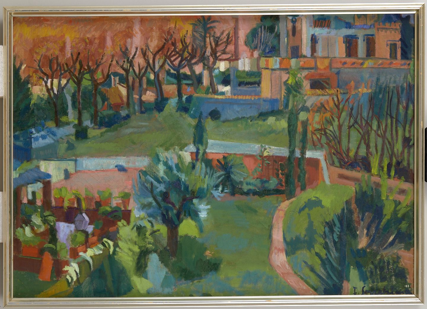 Isabel Serrahima Villavecchia (Barcelona, 1934 - 1999) va néixer en el sí d’una família d'advocats, escriptors i artistes, entre ells el seu besavi Maurici Serrahima, un dels fundadors de la Sala Parés de Barcelona. Als 20 anys, decideix dedicar-se a la vida artística i abandona els estudis en contra de l'opinió dels pares. S'inicia en la pintura amb Cirici Pellicer i assisteix a la classe de Núria Llimona. En aquesta època fa els seus primers dibuixos, ceràmiques i olis. Influenciada per l'impressionisme i Cézanne, Serrahima va conrear especialment el paisatge urbà de Barcelona (com en aquesta vista de Sarrià), retrats i la natura morta. Entre la dècada dels 70 i 80, Serrahima va col·laborar a favor de campanyes de solidaritat veïnals i polítiques. D'una banda, al seu barri de Sant Gervasi de Cassoles, dibuixa els logotips de les campanyes per salvar Can Castelló i l'Auditori Manent i fa pintures murals de caràcter reivindicatiu al carrer i, de l'altra, amb un caràcter de denúncia política, crea diversos cartells en solidaritat amb les dones uruguaianes contra de la dictadura feixista del seu país. També va conrear el gravat i la ceràmica.
