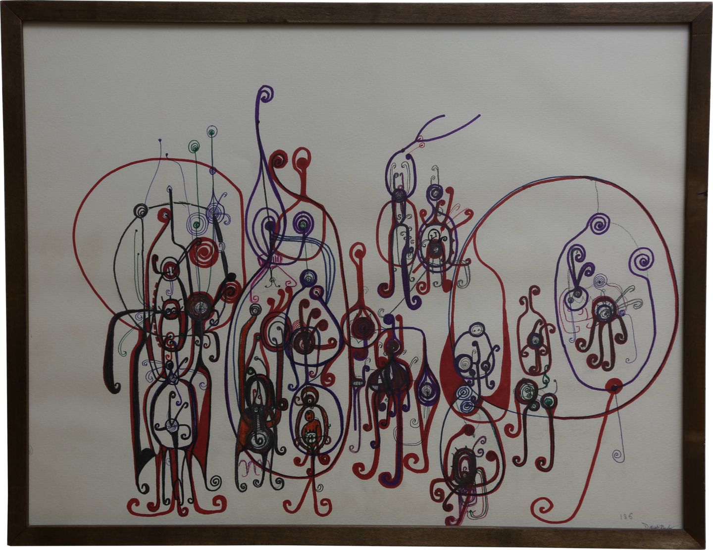 Damià Escuder (Sarrià de Ter, 1934 - Barcelona, 2011) va ser pintor i químic, conegut també com el “químic hippie” per haver estat un dels introductors de la contracultura i la cultura beat a Catalunya als anys 60. És un personatge difícil de definir per polièdric i alternatiu, intens activista polític, cristià i a la vegada seguidor del zen fins a ser ordenat monjo budista el 1984. A mitjans dels seixanta va formar part, a Girona, de la Confraria de Bevedors de Vi, un grup considerat com el primer “col·lectiu lisèrgic” de l'Estat Espanyol, pioner en el consum de l'LSD. La seva obra pictòrica, colorista i arrauxada, té influències del surrealisme i l'Art Brut però mai va entrar, per voluntat pròpia, en els circuits comercials. En els seus dibuixos, apareixen sovint grups de personatges esquematitzats, com en aquesta obra.