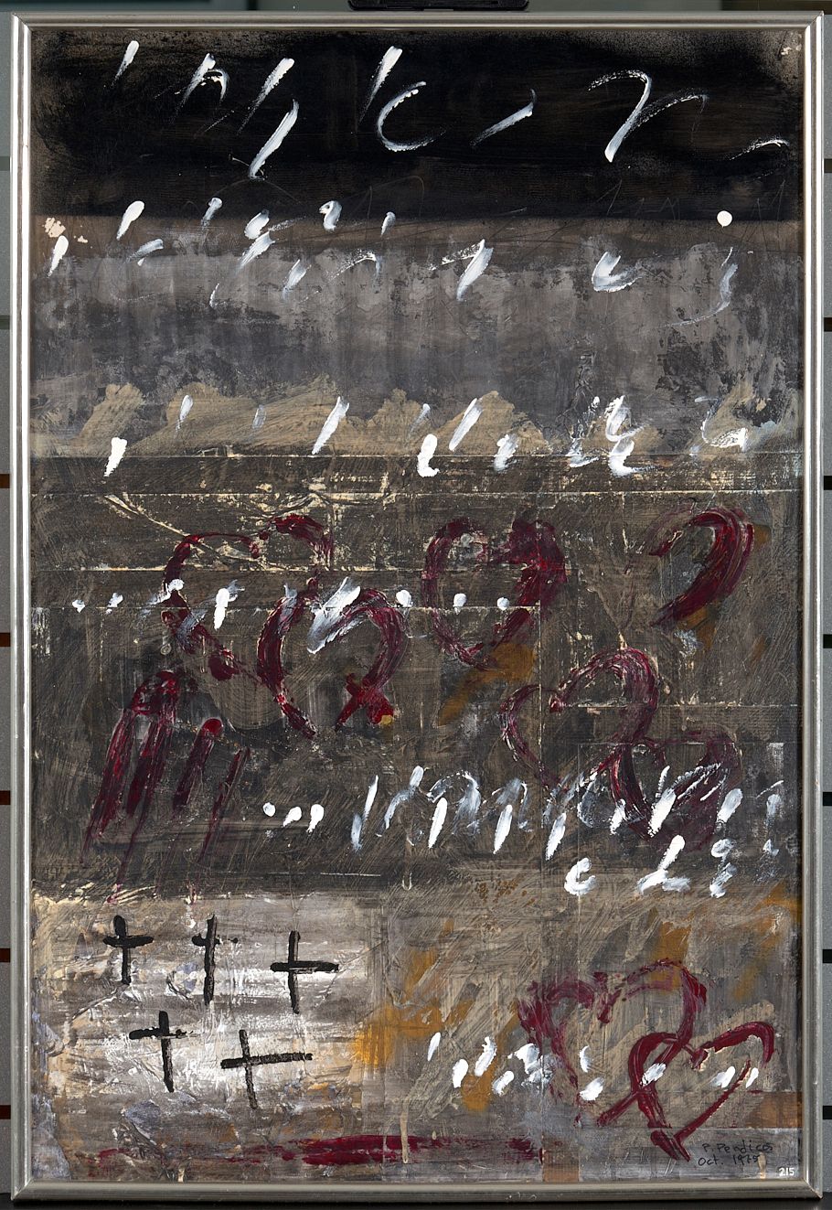 Pilar Perdices (Maó, 1931), pintora i gravadora menorquina resident a Barcelona, es va formar a l'Escola Superior de Belles Arts de Sant Jordi i va completar la seva formació amb estudis de psicologia. Va iniciar la seva trajectòria dins d'una figuració acadèmica, però a partir dels anys setanta va evolucionar cap a l’abstracció gestual -amb un ús regular del grattage i el dripping i de veladures superposades-, i l'informalisme amb una pintura farcida de símbols, lletres, pictogrames i noves textures, com fa en aquesta obra. Als anys 80 comença a pintar grans formats amb cartons reciclats, i partir dels noranta incorpora els seus llibres sobre paper, en què pinta i escriu, i es dedica al gravat. El 2011 Pilar Perdices va fer donació a Menorca d'una vuitantena d'obres representatives de la seva trajectòria.