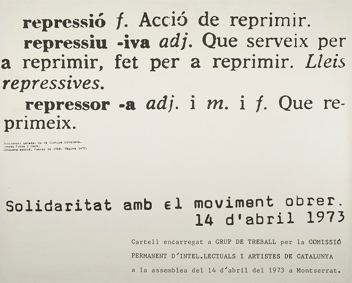 Encarregat per la Comissió Permanent d’Intel·lectuals i Artistes de Catalunya, aquest és un dels cartells que va realitzar el Grup de Treball (GDT), un col·lectiu d'artistes, adscrits en la seva majoria al moviment conceptual, que del 1973 al 1976 van realitzar una sèrie de textos, accions i exposicions sobre les pràctiques artístiques i la situació politicosocial d'aquell moment del tardofranquisme. Entre les accions del GDT, es recorda molt una forta polèmica a la premsa amb Antoni Tàpies i la publicació d'una sèrie d'anuncis a La Vanguardia a la secció de demandes com a obra d'art. Els artistes que van formar part del col·lectiu són Francesc Torres, Francesc Abad, Carles Santos, Jordi Benito, Maria Costa, Alícia Fingerhaut, Àngels Ribé, Pere Portabella, Antoni Mercadé, Muntadas, Dorothée Selz, Jaume Carbó, Xavier Franquesa, Carles Hac Mor, Imma Julián, Josep Parera, Enric Sales, Manuel Rovira, Santi Pau i Antoni Munné.