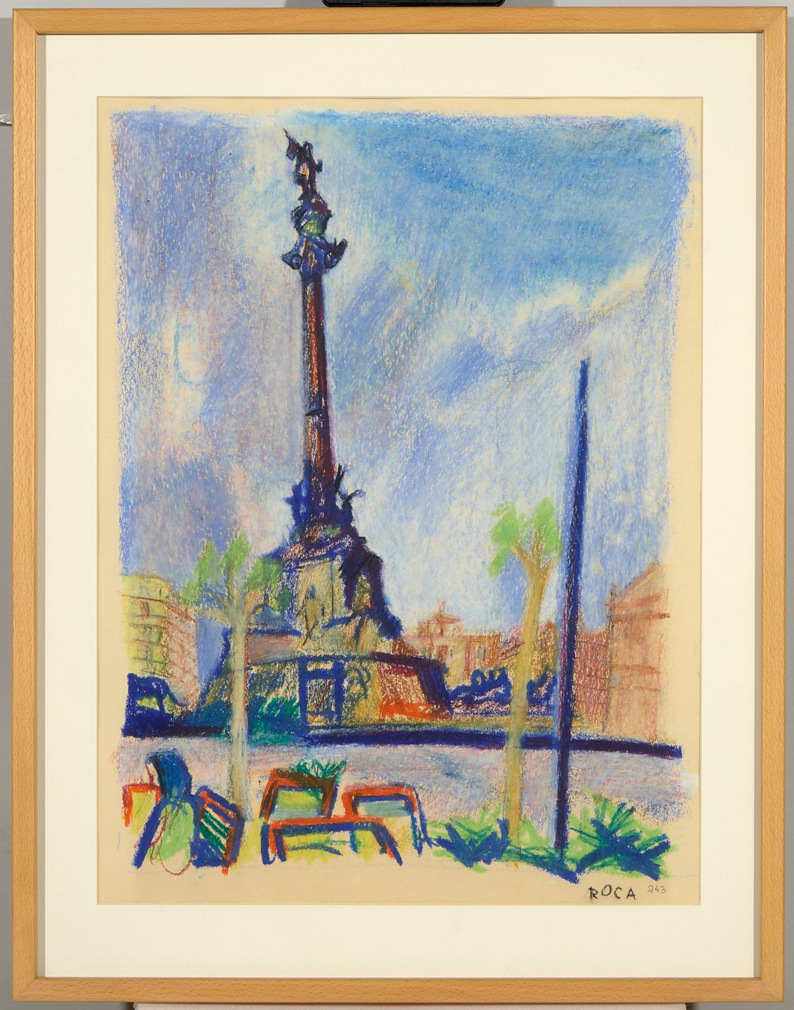 Josep Roca-Sastre (Terrassa, 1928 - Barcelona, 1997) fou pintor que, després d'estudiar dret, va iniciar la seva formació artística en el taller de Ramon Rogent. El 1953 va ingressar en el Cercle Maillol de l'Institut Francès, i va fer la seva primera exposició individual a les Galeries Laietanes el 1955. Va fer diverses estades a París on va freqüentar La Grande Chaumière de Montparnasse, va exposar a la Galerie Drouant i va guanyar el primer premi del concurs La Jeune Peinture. El 1959 va iniciar el seu vincle amb la sala Parés, galeria amb qual estaria lligat tota la vida. En la figuració de Roca-Sastre, hi una important estudi de la llum i una construcció geometritzant de les formes; entre les seves temàtiques preferides hi ha els paisatges urbans, com aquest de la zona de Colón a Barcelona, i motius com les tribunes modernistes de l'Eixample, els passadissos de rajols hidràulics i els bodegons amb cortinatges.