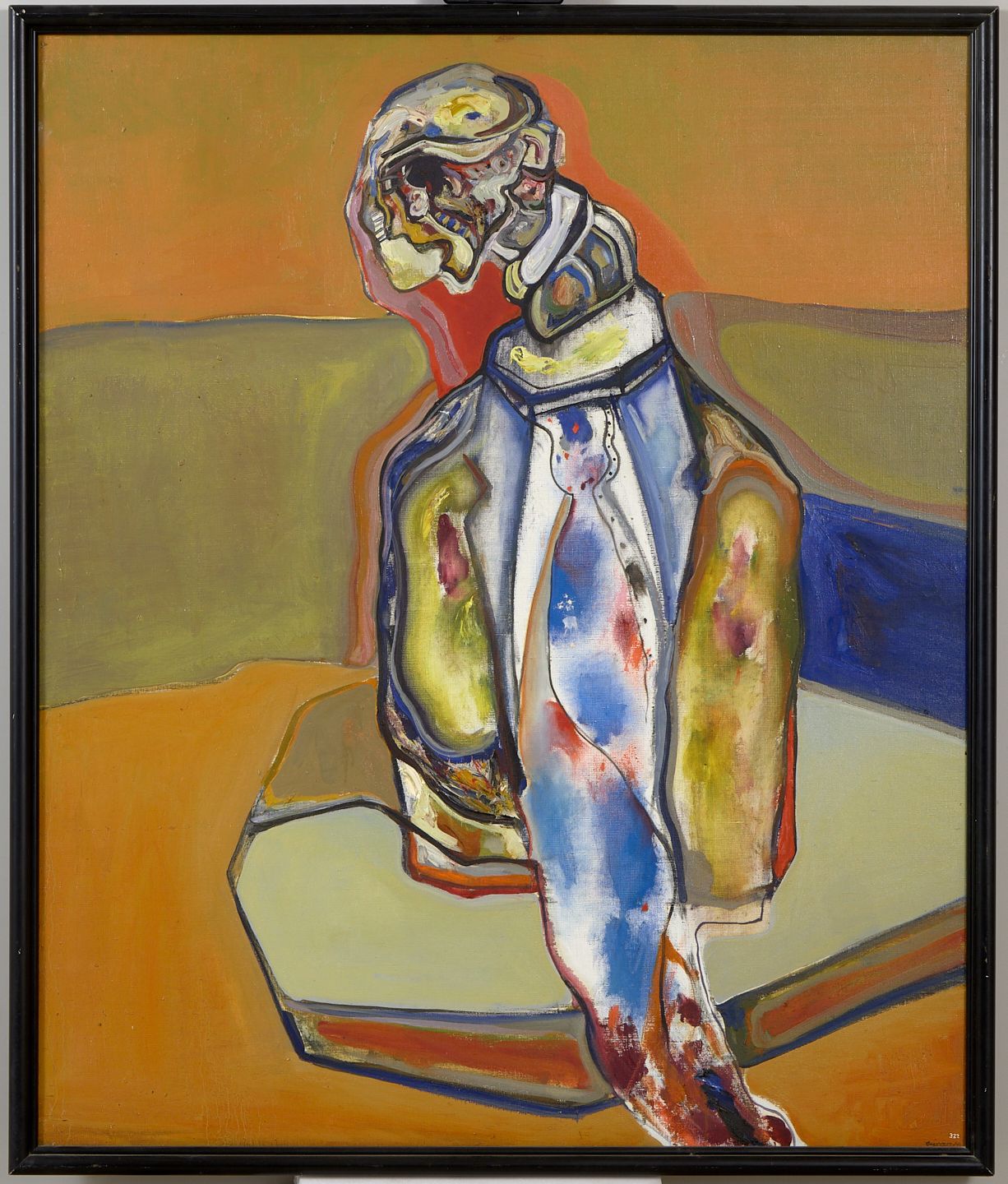 José María Guerrero Medina (La Guardia, Jaén, 1942) és pintor, dibuixant i gravador de formació autodidacta, andalús resident a Catalunya. Amb una trajectòria molt coherent i una vocació per l'art molt marcada des de que era petit, Guerrero Medina va iniciar la seva carrera amb obres centrades en la figura humana, tractada amb una mena de procés de “desfiguració”, amb la intenció de fer palesa la intimitat dels personatges, sobretot el seu dolor, angoixa i soledat. Els cossos i els rostres sovint es deformen i s'esborren, com en aquesta obra on podem sentir l'angoixa d'aquest personatge encorbatat. De la mateixa manera, Guerrero Medina tracta el paisatge amb la mateixa intenció, sovint amb tons terrossos, grisos i ocres, accentuats amb taques de colors vius. És un artista compromès que ha tractat directament temes socials i polític com l'execució de Salvador Puig Antich i l'exili del 1939.