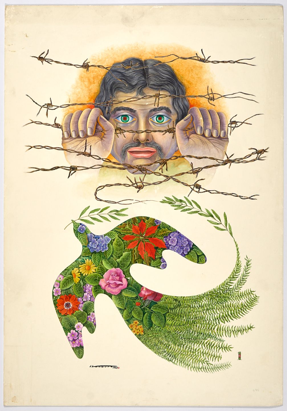 Isidre Ventura (Barcelona, 1915 - 1994) fou pintor, gravador i dissenyador gràfic format a l'Escola Industrial de Barcelona. A partir de 1930 va desenvolupar la seva activitat en el món de les arts gràfiques, treballant per a Manen Graphics, Litografia Sabadell, Tardiu Fotógrabados, Postals Artigas o Editorial Marcos, i també com a retolista per a diverses marques comercials. Ventura pintava, sobretot aquarel·les, per afició, i a principis dels 70 va arribar a exposar durant cinc anys consecutius a la fira de Basilea. En les seves obres, el virtuosisme tècnic s'afegeix a una barreja de surrealisme, simbolisme i minimalisme, i a la sàtira i denúncia social i política, com es pot veure en aquesta obra on crida per la pau.