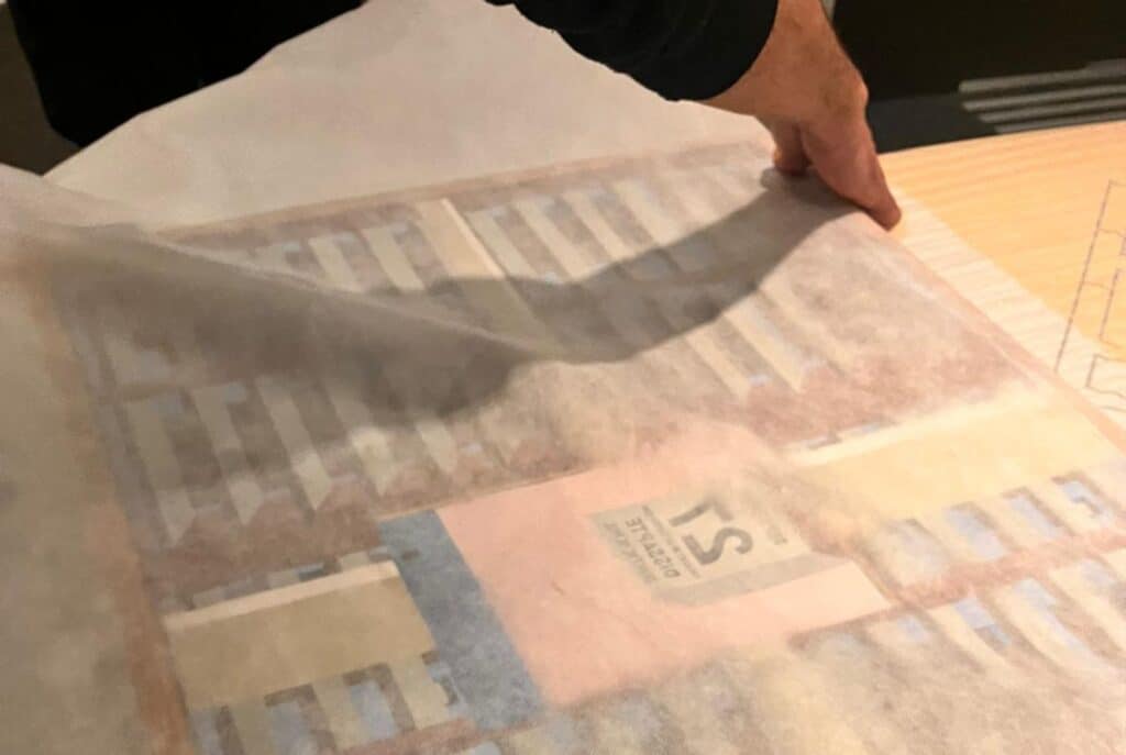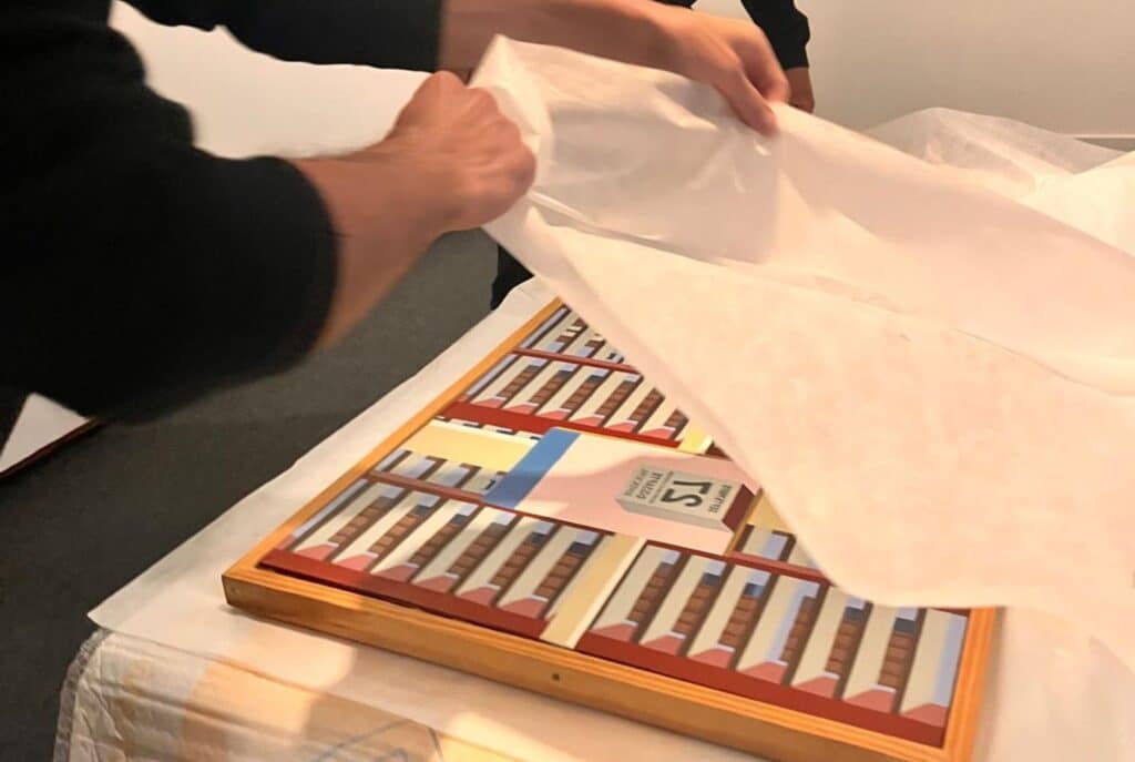 Les imatges mostren el moment d’embalar l’obra per al transport, un procés minuciós que garanteix que La persiana arribi a Can Framis en perfectes condicions.